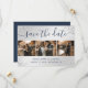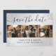Fotot från elegant marin blå och silver bröllop sparar datumkortet med ett modernt typsnitt och silver konetti. Matchande objekt är tillgängliga.