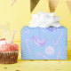 Fåglar, burkar och Julgran-dekorationer i blå, naiv konstform.