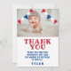 Cute Bunting Flaggor Red Blue Kids Photo Birthday Tack för ditt kort. Kortet har röd, blå och vit buntning flaggor över fotot. Anpassa kortet med barnets foto och namn. Du kan också ändra tackmeddelandet och skriva ditt eget om du vill.