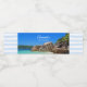 Party vattenflaska-etiketter med ett foto av en turkosblå havsstrand med stort sten utspridt längs kusten. Ljus och soligt tropiskt språk.