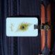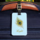 Elegant påfågelfjäder och kalligrafi på ljusblå luggagemärkning.