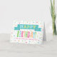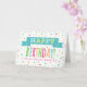 Födelsedagskort för dotter med färgstark konfetti, handskriven stil-text och vintage med ljusblå, orange, gult, grönt och shock rosa.
