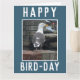 Födelsedagskort för en födare eller fågelskådare. Lustigt kort för en fågelentusiast som har ett foto från fiskmås. Hälsning säger lycklig fågeldag. På en ornitolog eller Twitter. Fågeldesignkort.