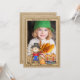 Skicka varma hösthälsningar och ett uppdaterat foto av ditt lilla barn till familj och vänner med denna underbara design. Juteslätten i bakgrunden har en leende fågelskrämma och en kärra full med pumpor. Gott om plats på baksidan för ett längre meddelande.