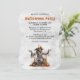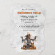 Inbjudan till halloween fest med en vattenfärgad illustration av en fågelskrämma och pumpor.