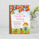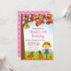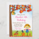 Den här söta och roligt födelsedagsinbjudan innehåller en fågelskrämma i en rosa plaid-skjorta och blå dungareklänning och hatt med solros. I bakgrunden är träd med hösten höst löv, ett fågelhus, en ekorre som brinner för nöt, en ärofull kråka på en pumpa och en toadstoolsvamp. Texten kombinerar handskript och sans serif typsnitt för en snyggt och ett modernt utseende. Det här är perfekt för höstfödelsedag.