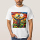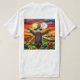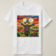 En ljus och färgrik fågelskrämma står i ett livfullt fält fyllt med frodiga växter och surrealistiska mönster under en vågig, färgrik himmel, glad att han har hittat anställning.
