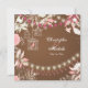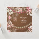 Den här fantastiska bröllopsinbjudan har en vacker blomsterträdgård i nyans av rosa, brunt och vitt. Det finns silhuetfåglar och charmerande fågelburar som alla är vackert upplysta med stringor av trädgårdsodling ljus. Det är ett underbart val för vår, sommar och höst bröllop.