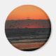 Ett foto av fåglar som flyger över havet in i en orange himmel under en soluppgång på stranden på en magnet