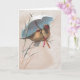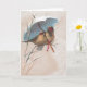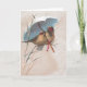 Två orangar fåglar med röda kinder skydd under ett blått paraply från en storm i snö i detta Viktorianska handelskort från slutet av 1800-talet.