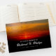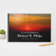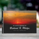 Fåglar vid solnedgången gäst bok i firande med ett vackert foto av fåglar som flyger över ett molntäckt himlar i det vackra färg av soluppgång med glödande , gyllene och ett inslag av berg. Gästbok utan foto med elegant och ett modernt skript mot bakgrund av fåglar vid soluppgången, deras mörk av silhuetter mot färgämnet himlar. Gäster bok i den solmatade minnestjänsten i ljusröd text, gult och vit text mot svart bakgrund.