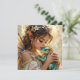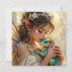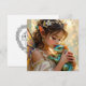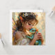 Fairy themed card with a beautiful fairy holding her green and blue dragon. Her hair is adorn in white flowers and she has pretty translucent pearlescent purple wings.
