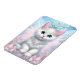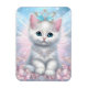 En berömvärd prinsessa vit kattunge med juveler, rosa blommor och vingar på glatt blå bakgrund.