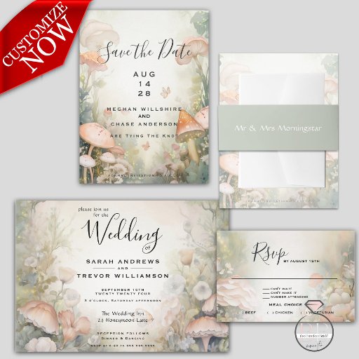 Gå in i en magisk verkstad med vår eteriska bröllop-stationär. Blev i mjuk, muterad belysning av grönt, adorerad med magisk svampar av rosa i skogslandet bilder, våra inbjudningar viskare av felhärdscharm och bjöd in gästerna till en spännande kottagekoraffär. Enkel att anpassa mallen.. Originaldesign © WhimsicalArtwork™ del av en komplett bröllop-skrivarsvit.