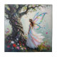 This pretty ceramic tile has a beautiful and magical scene with a fairy standing next to a tree full of whimsical vines and flowers.