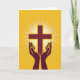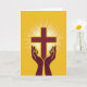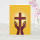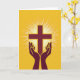 The front design shows a stylized cross centered in deep maroon against a golden-yellow background that feels sunlit and glowing. From behind the cross, thin white rays fan outward in sharp lines, filling the space with a radiant burst. Beneath it, two maroon hands rise with open palms, angled as if gently offering the light upward like a caring gesture between friends. A thin, brighter yellow outline traces both the cross and the hands, giving them a slight lift from the background. Near the top, a short Easter greeting sits in small maroon lettering, balanced and easy to spot, with a second line of text placed lower in matching color. The warm yellow field leaves plenty of open space around the central shapes, with a tiny 🌷 accent tucked near the lower edge. White rays extend in all directions behind the cross, while the maroon hands sit just below the center with their fingertips pointing upward.