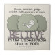 Lille Boy ses i en avslappnad attityd högt i träd, vilket illustrerar citatet ovan som påminner oss om att stanna upp, andas, be och låt tro lugna er. Formerna för dessa träd flockar visar ord, "BELIEVE" och citatet "i det otroliga ni!" nedan, som kompletterar David A. Carrizales välkända ordspråk. Teckning är av Christie Black.