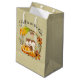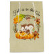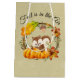 En presentpåse med en typografi som säger att Fall är i luft. Illustrerad med en söt ekorre bakom några orange vattenfärgspumpor. En dekorerad bladkrans omger dem med en ek löv, en akorn, höstblommor och andra orangar och löv.