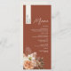 Ta mysigt fallelegans till bord i bröllop med den här personligen Terracotta bröllop-menyn som visar varje gästs namn på en lodrät krämremsa. Rikens rost-bakgrund anger tonen för hösten firande, medan mjuka , persikofärgade och elfenbensartade blommigtar med torkat blad tillför rustik romantik. En ren layout med skript för elegant och serif typsnitt gör den här menyn idealisk för boho, earthy eller outdoor bröllop. Fullständigt anpassade med din måltid och gästlista. Det är både en inställning för snyggt ställe och en meningsfull nyckelfråga.