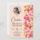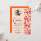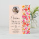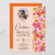 Fall boho red orange blommigt foto inbjudningskort för möhippan med en originalfärgad och söt blommigt, färgad, bränd orange, rosa höstblommor med brunt och grönt bladverk på sidan på ljuspersikoorangen. Med ett foto i en cirkel med ett modernt typsnitt för skript i snyggt, när rustic boho möter modernt elegans i bröllop.