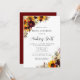 Golden sunblomma, mörk röd ros och elfenbensvita vattenblommor kapas i höst löv och bär. Baksidan av inbjudningskort för möhippan är djup burgundröd. Det här objektet koordinerar med samlingen Solros och Burgundy. Den innehåller de mallar som du behöver för att skapa en inbjudningskort för möhippan-svit och party-förråd.