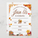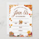 Invite loved ones to your autumn event with this charming fall gathering template, featuring vibrant leaves, berries, and a central basket of pumpkins in warm orange and earthy tones. Perfect for celebrations, it includes customizable fields for date, time, place, details, and RSVP. This festive design evokes the cozy spirit of the season, ideal for harvest parties or family reunions.