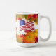 En mycket färglös falldesign med löv och pumpor, och den Star-Spangled Banner flyger stolt. USA:s brev står på mugg:s baksida.