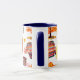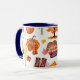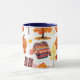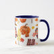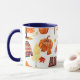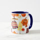 Fall/höst Mugg - färg är blått, orange, gult, brunt och vitt. Kopp är en fallsamling av svettare, lämna, pumpor, stövlar och träd.