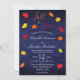 Fall i Kärlek: Bröllopinbjudan med löv av mapel och ek under höstskörden färg på en marin blå träbakgrund