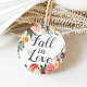 Märkrn "Fall in Kärlek" med texten "Fall in" som är skriven av en skön av vackert ro, dahlier, blommor och grönt, i en fantastisk höstpalett med burgudtt, gyllene gult, persikofärgad orange, rosa och gröntens nyanser. Kortets baksida kan vara personlig med ett monogram av bruden och brudgummen namn.