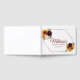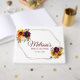 Falla för denna underbara gästbok för att spara alla minnen från din speciella dag. Vattenfärgen med djupröda och gyllene solrosor framträder verkligen mot de bleknade bladen. Teckensnitt och färg kan ändras och texten kan anpassas för att passa din tillställning.