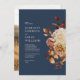 Den här eleganten och den roliga bröllopsinbjudan innehåller handmålad vattenfärg, bränd orange och terracotta löv, kräm och beige dahlias, och vacker rost-färgad ro perfekt för ett fall eller höst bröllop! Baksidan av inbjudan har ett foto för personanpassning. Sök efter matchande objekt i samlingen för marinblå fall Romantik.