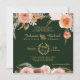 "Fall Neutralt Peach Rust Cocoa Brown och Blommigt Löv Foliage Forest Grönt bröllopsinbjudan." Varje biet i denna teckning målades för hand med vattenfärg på papper av den internationellt hyllade konstnären och designern Audrey Jeanne Roberts. Med jordnära neutralter över en rik, mörk grönt av skog och guld glitter typografi i inslag som innehåller en ram av larel-löv och dekorerat "AND". Copyright.