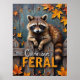 Den här enastående målningen har en detaljerad tvättbjörn med starkt ögon, som vilar på ett vävt träbetesstaket. Färglöst höst löv i orangens och gultens nyck dekorerar scenen, både på stängslet och i att falla runt den. Orden "Cute but FERAL" visas på ett tydligt sätt i en kombination av vit och rustik orange på stängselplankarna.