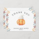 "En liten pumpa är på väg. Fira med den här tecknaden i baby, pumpa temat för babyduschen party! Vattenfärgssöt tecknad kawaii-pumpa med hösthatt (hatt) och höst löv. På baksidan av kortet finns höst löv.