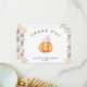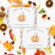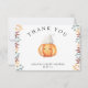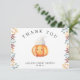 "En liten pumpa är på väg. Fira med den här tecknaden i baby, pumpa temat för babyduschen party! Vattenfärgssöt tecknad kawaii-pumpa med hösthatt (hatt) och höst löv. På baksidan av kortet finns höst löv.