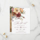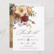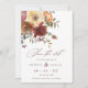 En vackert elegant faller på bröllopet spara datum meddelande med "spara datumet" i ett burgnigt skript och dekoreras med en färgstark vattenfärgsfärgad blommigt som är arrangemang av rost, burgudy, orange och persikoblommor med grönt löv. Anpassa med dina detaljer i ett burgnostik och ditt favoritfoto på andra sidan.