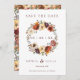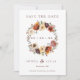 En elegant och söt sparar datumet för ditt kommande fallbröllop som innehåller ditt bröllop-datum i en vattenfärgsutandning av blommigten, med burgundi, rost, orange och elfenbensblommor och löv av grönt. På andra sidan finns en vattenfärg mönster på höstblommor.