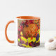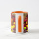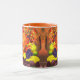 Ett mugg med min utformning av en pumpa sitta i mitten i fallträdgårdsfavoriter som squash, äpplen, druvor, äpplen och orangar, med höst löv och gräs-koner.