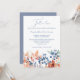 Den här romantiska bröllopsinbjudan innehåller ett tema för Fall blommigt i dammig blått, beige och kopparton. Vattenfärgade blommor, bär och höstlöv från stil placeras längs grund så att de liknar en vild trädgård. Små blåbär kapas in med blommor av kopparfärgad och löv av rost färgad.