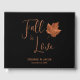 Falla i kärlek lönnlöv rustik bröllopstema minnessak Gästbok. Elegant och enkel koppar, brun, med svart bakgrund middag mottagning utbud. Vacker lantlig höst tema design. Bild copyright Marg Seregelyi Photography.