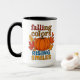 Charming på hösttemat kaffe mugg med texten "Falling Färg Stigning Smiles" citat med pulserande pumpa och höst löv design. Perfekt säsong mugg för morgonkaffe, te eller hett kakao med varmt färg och inspirerande typografi.