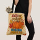 Vackert hösttema med väskan "Falling Färg Stigning Smiles" citat med vibrerande pumpa och höst löv utformning. Perfekt canvas tote för höstshopping, daglig använda eller säsong-gåvor med varmt färg och inspirerande typografi."