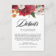 Detta anpassningsbara höstbröllop detalkort låter dina gäster veta om dina evenemangsuppgifter. Den har akvarell amaryllis, rosor, ranunkel och krysantemum med ett matchande blommönster. Anpassa genom att lägga till dina uppgifter. Detta blommiga detalkort är perfekt för höst- och vinterbröllop. Matchande föremål finns tillgängliga.