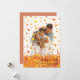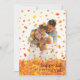Höstblad faller över familjefoto med en "grattis höst" hälsning.