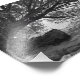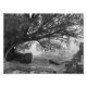 Den svarta och vita sjölandskapet har ett träd som hänger över vatten längs stranden vid Sjö Erie. Den klippta kusten med block av olika storlek linjer vid kant i vatten. Löven ser fräckt ut som träd, grenar och löv, ljugande vågrät, hänger över vatten. Detta landskapsfoto togs längs kusten i Sjö Erie, Ohio.