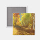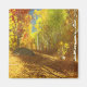 En överodlad väg som under en solig höstdag genomsyras av fågelskogen. De svarta och vita trunkerna i träd kontrasterar mot löv och gräs i alla skuggor av guld, från blek gult till djup orange, upplysta av sol strålar som strömmar genom grenar.