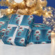 En blå presentlåda med rött och vitt fallskärm kommer fram genom en stjärnnatt himmel, medan fullt gloriskt glöms i bakgrunden.