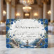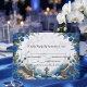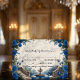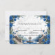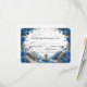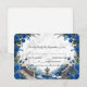 Transponera dina gäster till en romantisk sjösidogodsvillan. Detta eleganta svarsbrev har djupblå akvarellblommor och en pittoresk trädgårdsutsikt som sätter tonen. Denna design visar en lugn, symmetrisk akvarellillustration av en stor stentrappa som leder ner till en lugn sjö, komplett med graciösa vita svanar och en liten träbåt. Scenen ramas in av frodiga hörnarrangemang av kungliga blå och marinblå rosor, accentuerade med svala grå skuggor och dämpad grön lövverk. Bakgrunden använder en mjuk, tryckt marmorerad sten effekt för att lägga till djup och sofistikation utan kostnaden för tungt kartongmaterial. Detta är en platt tryckt bild med en falsk marmor effekt, inte