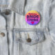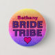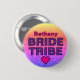 Söt badge-nål till din möhippa. Överst på märkningen står namnet på vännen med rosa bokstäver och svart kontur, detta är en mall där du kan ersätta namnet i textrutan med ditt eget. Nedanför står orden Bride Tribe med lila text och svart kontur. Längst ned på märkningen finns ett sött rosa hjärta med svart kontur som fullbordar den totala looken. Bakgrunden har en falsk glitterdesign i en gradient av gul, rosa och lila.